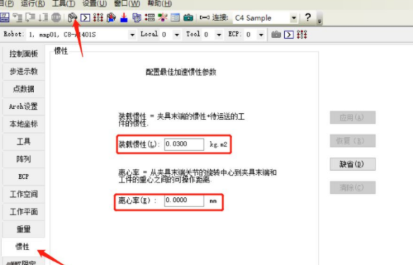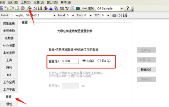 末端夾具的重量,慣性,離心率的設(shè)置至關(guān)重要,正確設(shè)置可降低機(jī)器人故障率,還可以增加機(jī)器人的使用壽命。重量設(shè)置如下圖所示: