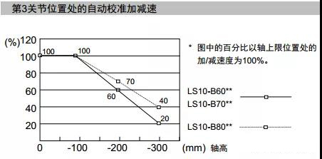 當?shù)?關節(jié)(Z)處于高位情況下,在水平PTP動作期間移動機器人時,動作時間將更快。當?shù)?關節(jié)低于某點時,便會利用自動加/減速度來減小加/減速度。(請參閱下圖)軸的位置越高,動作加/減速度越大。但在上下移動第3關節(jié)時就需要更長時間。請在考慮當前位置與目標位置之間的關系后再調(diào)整機器人第3關節(jié)的位置。利用Jump命令在水平動作期間實現(xiàn)的第3關節(jié)上限可通過LimZ命令進行設定。